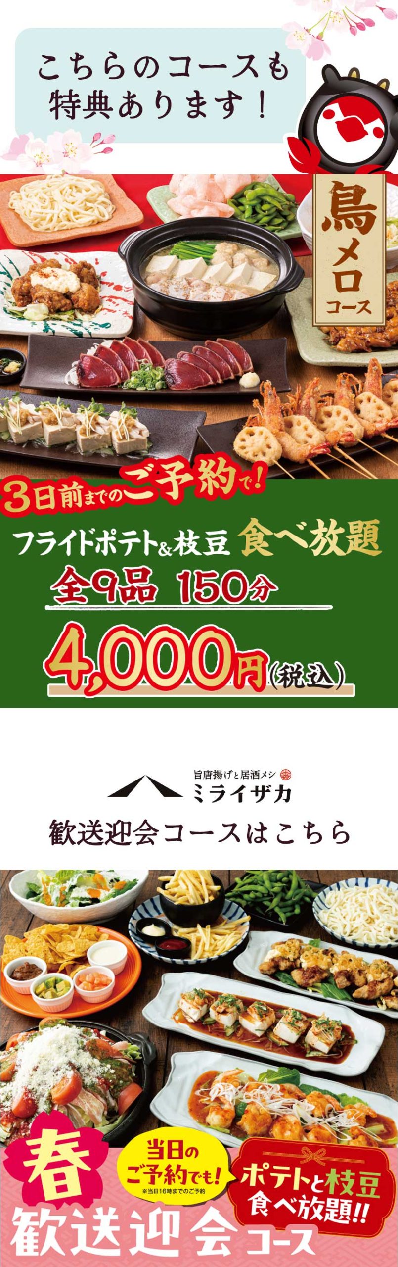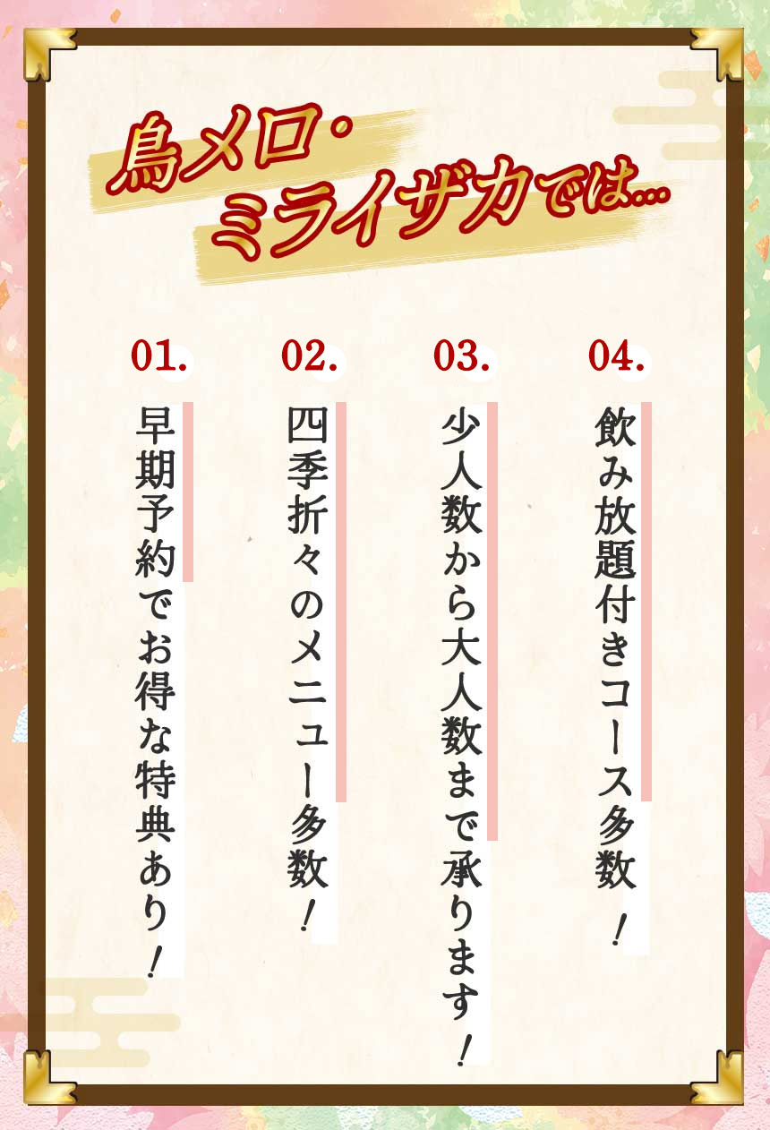 ●シーザーサラダ ●枝豆 ●清流蒸し鶏と豆腐の葱生姜ソース ●本鮪 ★黒毛和牛のすき焼き ●鶏のから揚げ&ポテトフライ ●大海老の秘伝チリソースがけ ●特製つくね ●黒毛和牛の炙り寿司 ●〆うどん